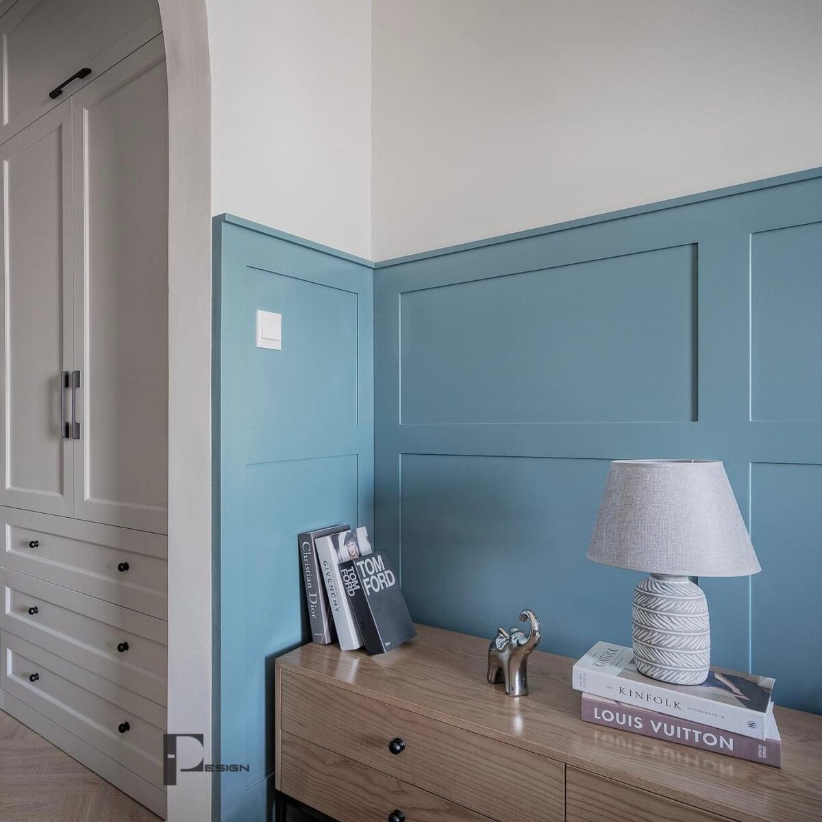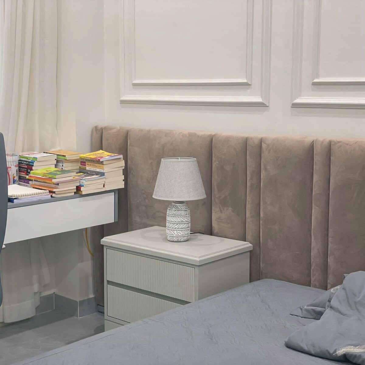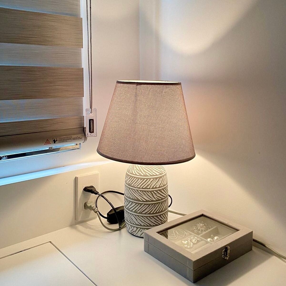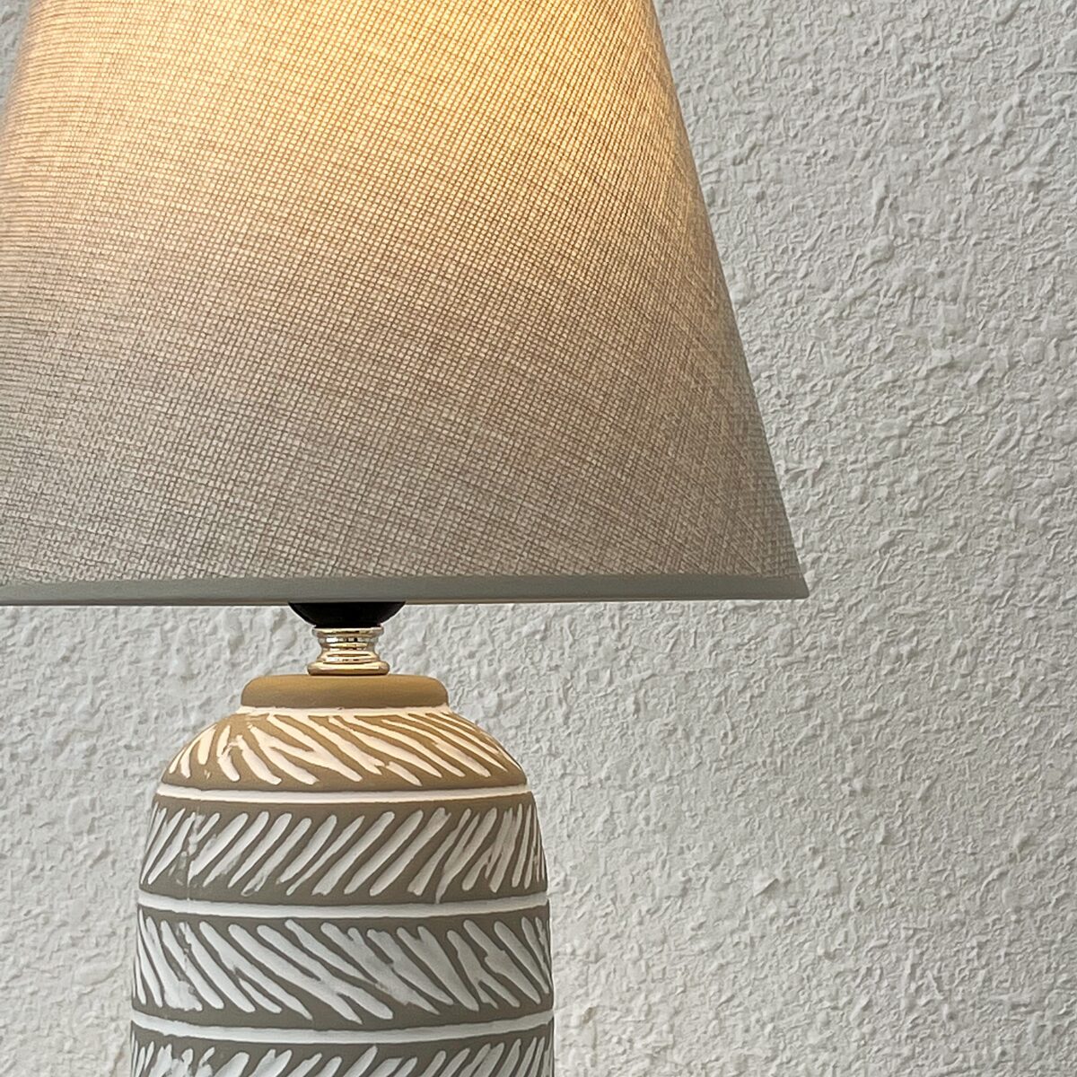Thân đèn gốm sứ nung nhám cùng họa tiết kẻ trắng đơn giản nhưng vẫn tao nhã, cuốn hút, dễ kết hợp nhiều tông màu và phong cách nội thất khác nhau.