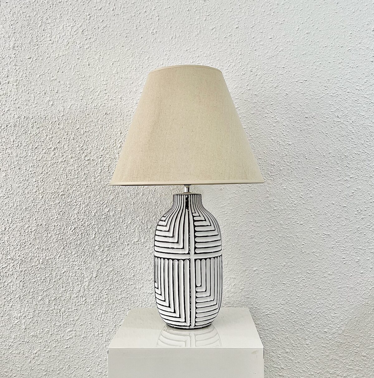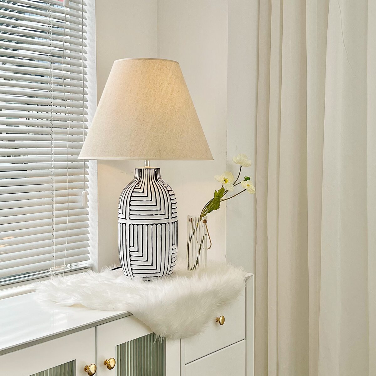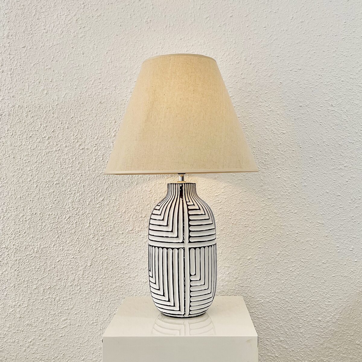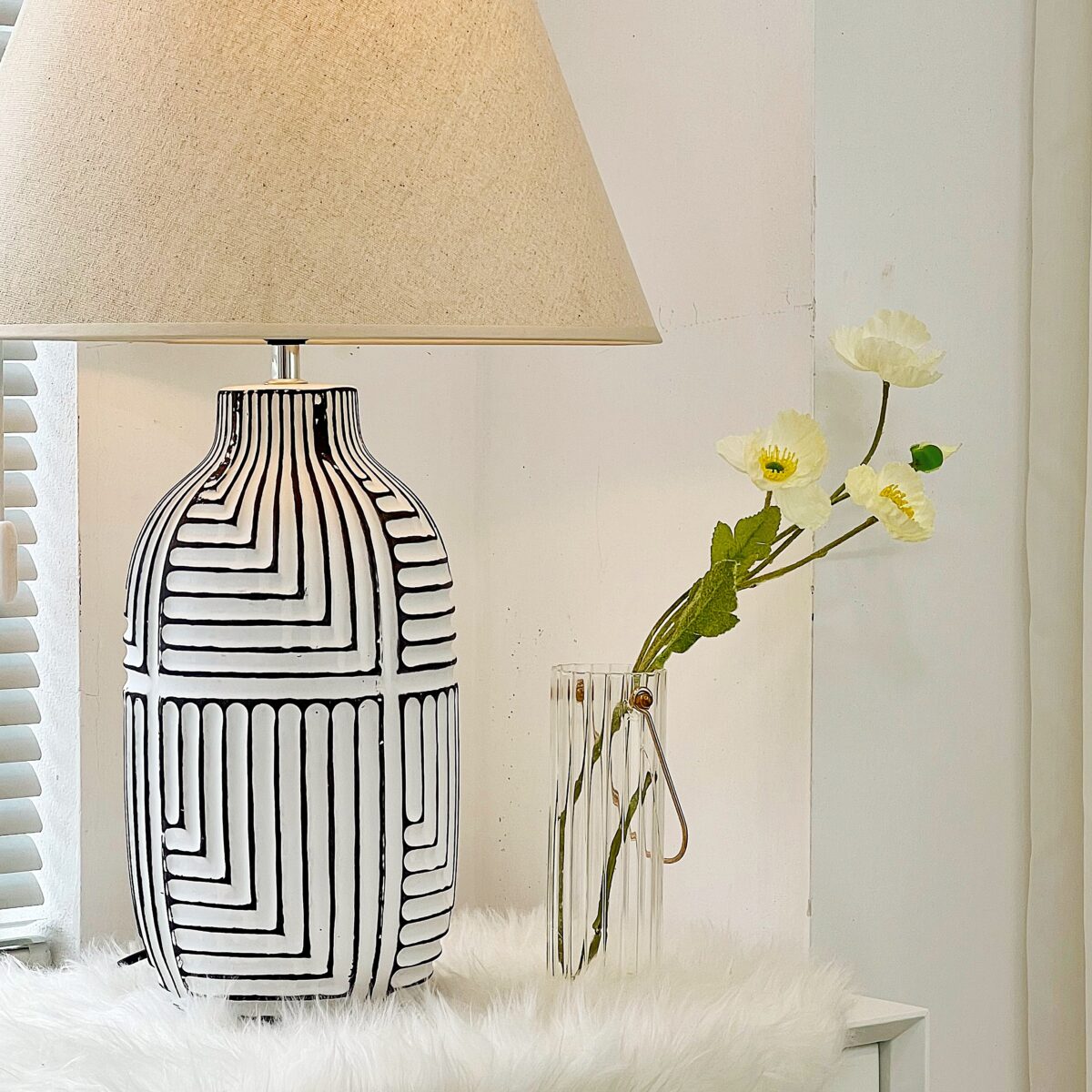 Chiếc đèn bàn với một kiểu dáng đơn giản với các sọc kẻ đen độc đáo. Thân đèn được thiết kế thanh lịch , tối giản mang đến sự mới mẻ cho không gian kết hợp cùng chao đèn màu be nhẹ nhàng, dịu mắt khi sử dụng đèn.