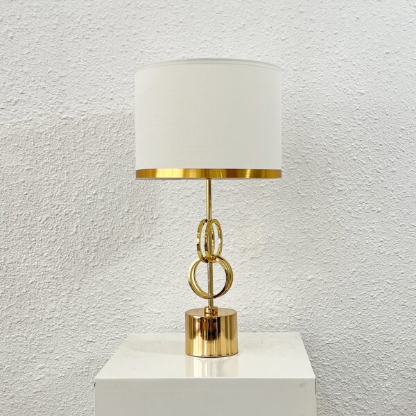 Với thiết kế các vòng tròn liên kết lạ mắt cùng màu vàng bóng sang trọng. Chao đèn trắng được viền dây kim loại vàng thêm phần luxury.