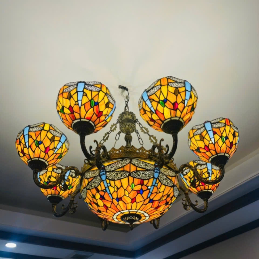 Đèn chùm Tiffany VLCHTF-040 có thiết kế 8 chao hoa màu vàng bắt mắt, cùng với đó lại họa tiết hình những chú chuồn chuồn màu xanh sẽ giúp đèn trở lên mềm mại và ấn tượng hơn. 2 màu cam và xanh tưởng rằng như sẽ chẳng có gì liên quan đến nhau nhưng khi kết hợp lại và đưa vào sản phẩm VLCHTF-040 thì lại hòa hợp đến 1 cách không tưởng.