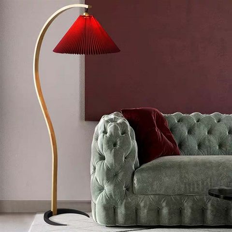 Đèn sàn cần cong thân gỗ chao vải nhựa xếp màu đỏ VLDSCC-031-RE