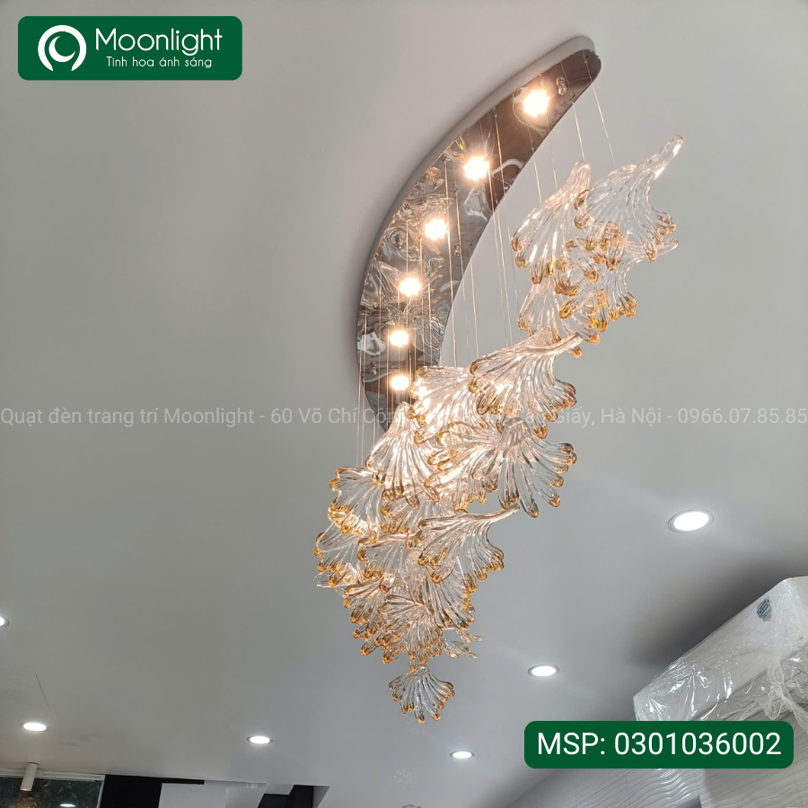 Thiết kế mâm bán nguyệt hiện đại kết hợp cụm 35 lá thủy tinh tạo hiệu ứng “dòng chảy ánh sáng” mềm mại, rất phù hợp treo tại sảnh, lối vào, khu bếp – bàn ăn hay không gian thông tầng thấp. Ánh sáng LED 3 màu đổi tông linh hoạt (vàng ấm/trung tính/trắng), phản chiếu qua từng cánh lá viền mạ vàng, giúp không gian sang trọng và nổi bật như ảnh lắp đặt thực tế.